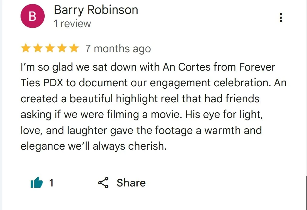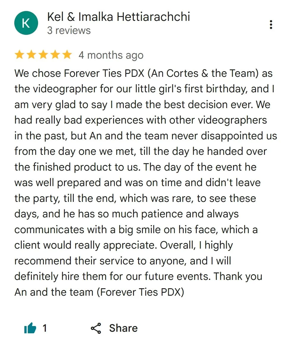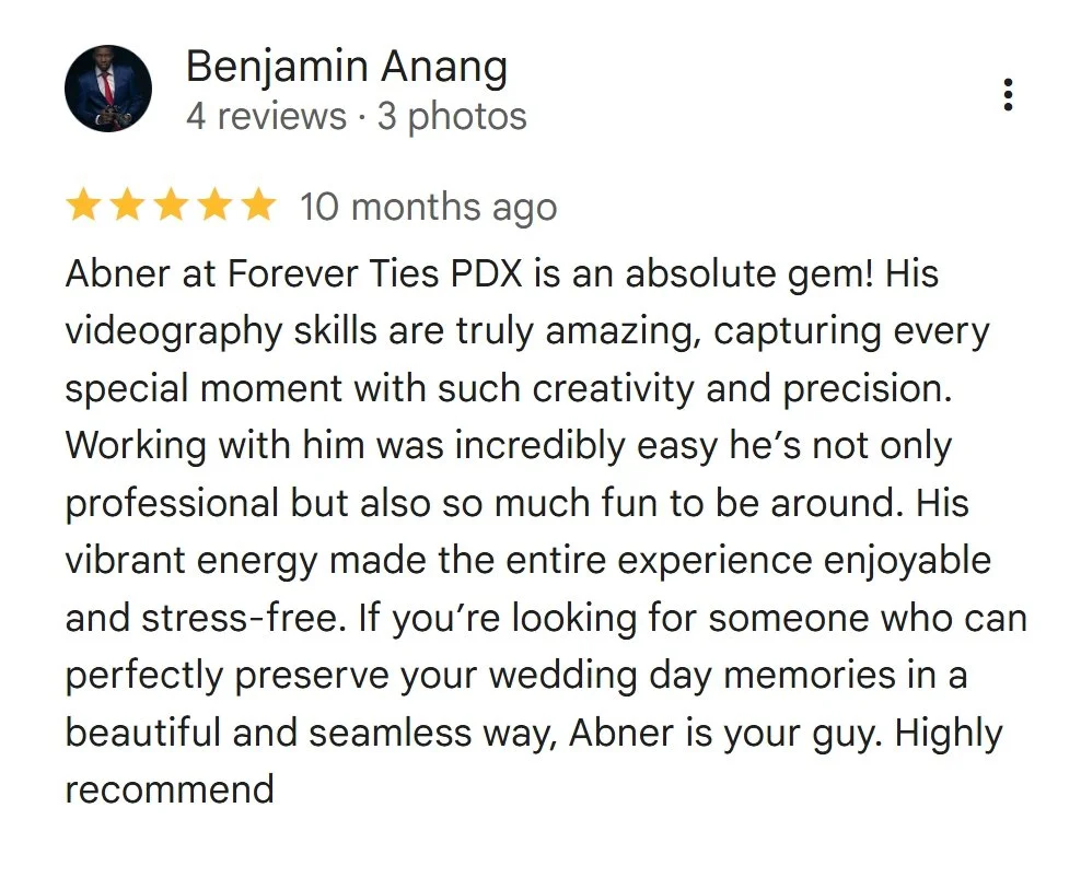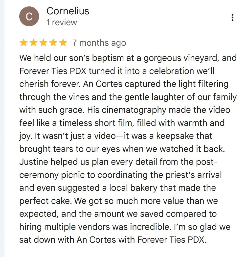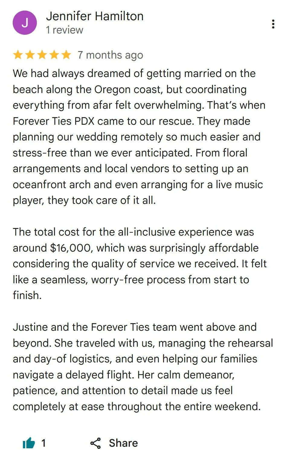 Our reputation is built on real reviews, genuine trust, and a commitment to working with couples of all budgets. We believe everyone deserves exceptional services, and we would rather provide a little flexibility in price than see you risk your wedding with an inexperienced team that could ruin your most important memories. With Forever Ties PDX, you receive dependable professionalism, elevated artistry, and images that feel timeless, intentional, and beautifully crafted.
